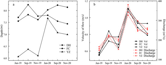The hydrological changes in DH, FC, and YZ from June 2019 to November 2020 are shown in Figure 2. The average depth in DH, FC and YZ were 7.75 m, 7.89 m, and 6.71 m, respectively (Figure 2a). The water depth fluctuated significantly during the survey period, with the minimum water depth in June 2019 and the maximum water depth in June 2020, which was consistent among the sampling sites (Figure 2a). The discharge of the MRP was at a minimum of 145.66 m3/s in June 2019 and reached a maximum of 390.48 m3/s in June 2020. The MRP was at a high discharge (350 m3/s) for the first time in August 2019, and at a higher discharge (420 m3/s) for the second time from May to June 2020. The variation in Vel was from 0.55~1.11 m/s, with an annual average value of 0.83 m/s, a trend which was the same as that of discharge. (Figure 2b).