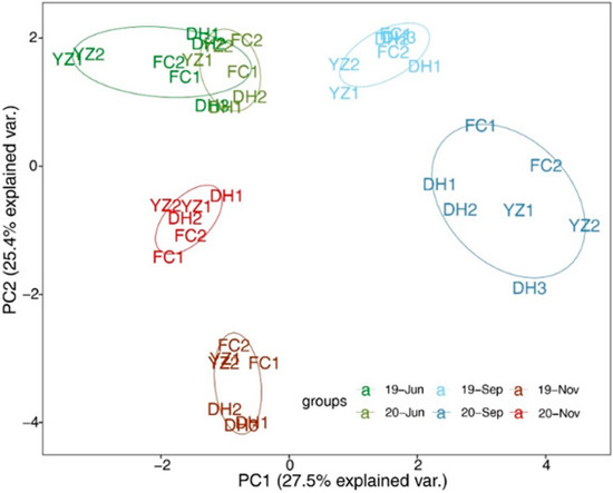 The results of PCA analysis showed that the PC1 axis explained 27.5% and the PC2 axis explained 25.4% of the variation (Figure 3). The analysis revealed the temporal variability of the environmental factors was greater than the spatial variability, indicating that the seasonal variability of the environmental factors in the samples was more evident. The environmental factors in June 2019 and June 2020 were relatively similar, the environmental factors in September 2019 and September 2020 were different, whereas the environmental factors in November 2019 and November 2020 were different.
