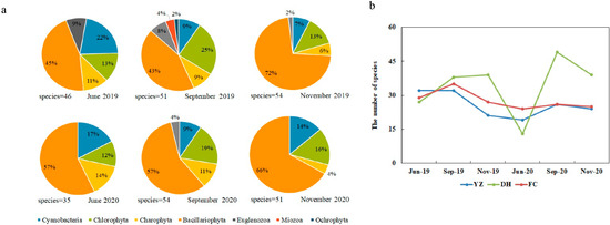 Spatial and temporal variation in species richness of periphytic algae by phyla in the sampling sites of MRP of SNWD: (a) Temporal variation in percentage composition of species richness during the sampling periods; (b) Temporal variation in total species richness during the sampling periods.