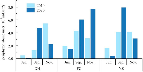 From June 2019 to November 2020, the abundance of periphytic algae in the Henan section of the MRP varied from 0.07 × 105 to 8.99 × 105 ind./cm2 with a mean value of 3.24 × 105 ind./cm2. The highest periphyton abundance (7.93 × 105 ind./cm2) was observed in YZ, while the lowest abundance (0.84 × 105 ind./cm2) was observed in DH. The average abundance of algae in FC was the highest at 4.12 × 105 ind./cm2, followed by YZ (3.56 × 105 ind./cm2), and DH (2.35 × 105 ind./cm2) (Figure 6). There were interannual differences and temporal variations in algae abundance. In June 2019, the abundance of all stations was higher than that of the same period in 2020, whereas in September 2019, the abundance of all stations was lower than that of the same period in 2020. Maximum average abundance of periphyton 4.5 × 105ind./cm2 was observed in September. November ranked second after September, with an average abundance of 4.5 × 105ind./cm2. The mean abundance of algae was the lowest in June (0.97 × 105 ind./cm2). Analysis of variance (ANOVA) showed that the abundance of algae was significantly different at different time scales (p < 0.05), but not in spatial distribution (p < 0.05).