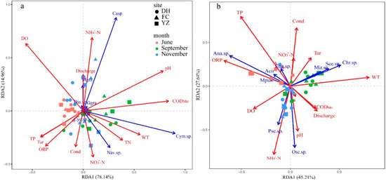 The RDA ordination diagram including 11 environmental factors and dominant species of nondiatoms, is presented in Figure 7b. The first two explained 93.1% of the total variability in the periphyton-environment relationships (RDA1 = 78.14% and RDA2 =14.96%). Monte Carlo permutation tests showed that CODMn (F = 20.18, p < 0.001), pH (F = 17.61, p < 0.001), DO (F = 9.19, p < 0.001), WT (F = 7.56, p < 0.01) and TP (F = 4.03, p < 0.01) were the most significant environmental factors influencing the changes in the dominant diatom community. Cymbella aspera was positive correlated with NH4+-N. Cymbella sp. showed a positively association with CODMn, WT, and TN. Aulacoseira granulate and Diatoma sp. were positively correlated with discharge and NH4+-N. Navicula sp. was positively correlated with WT and NO3−-N, and negatively correlated with DO (Figure 7b).