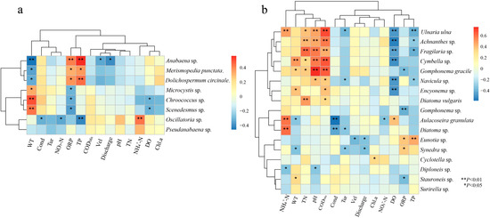 To further understand the influence of environmental factors on the composition of the dominant algae community, correlation analysis was performed between the abundance of dominant species and environmental factors. As shown in Figure 8a, Chroococcus sp. and Scenedesmus sp. were positively correlated with WT (p < 0.05), while Anabaena sp. was negatively correlated with WT (p < 0.05). Anabaena sp., Dolichospermum circinalis and Merismopedia tranquilla showed a positive association with TP (p < 0.05), Oscillatoria sp. showed negative correlations with TP (p < 0.01), conductivity and with NO3−-N (p < 0.01), as well as positive correlation with NH4+-N (p < 0.05). Anabaena sp. showed a significant negative correlation with discharge and Vel (p < 0.05).