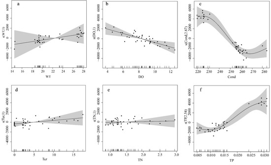 The results of the multi-factor GAM analysis of the MRP with environmental factors are shown in Table 3, with a coefficient of determination of 0.83 and an explanation of variance of 90.9%. The degrees of freedom of Cond, TP, ORP and CODMn were greater than 1, indicating that they were non-linearly related to the biomass of algae, whereas the degrees of freedom of WT, DO, Tur, TN, pH, NH4+-N and NO3−-N were all 1, indicating that they were linearly related to the biomass of algae. By comparing the F-values of the 10 environmental factors, they were ranked as follows: Cond > TP > NH4+-N > ORP > DO > CODMn. The F-values of Cond, TP, NH4+-N and ORP contributed more to the model, with F-values of 18.22, 16.14, 14.91 and 14.15, respectively, which were significantly correlated with the biomass of algae (p < 0.001). DO and CODMn had different effects on biomass, with F-values of 11.06 and 4.29. DO was significantly correlated with biomass (p < 0.001) and CODMn was significantly correlated with biomass (p < 0.01).