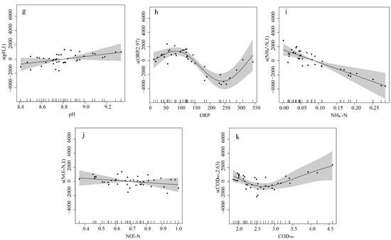 Illustration of the GAM for the effect of environmental factors on the biomass of the periphytic algae. (a) WT; (b) DO; (c) Comd; (d) Tur; (e) TN; (f) TP; (g) pH; (h) ORP; (i) NH4+-N; (j) NO3−-N; (k) CODMn.