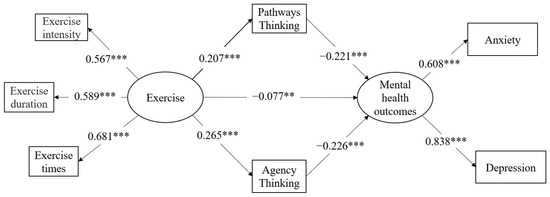 Model of indirect effect of exercise on mental health outcomes through pathways thinking and agency thinking. ** p < 0.01, *** p < 0.001.