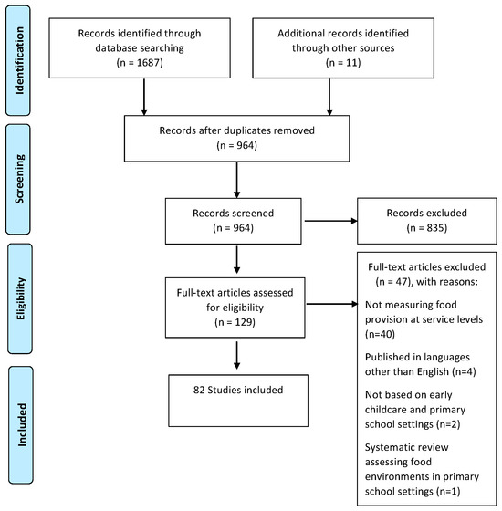 Database searching identified 1687 studies, with 964 studies remaining after removal of duplicates. After abstract screening, a total of 129 articles were identified for full-text screening with 47 articles excluded because they (a) did not measure food provision and/or compliance at a service level (n = 40), (b) were published in a language other than English (n = 4), (c) were not based within ECEC and/or primary school settings (n = 2) or (d) were other review articles (n = 1). In total, 82 articles were included in this systematic review (Figure 1).