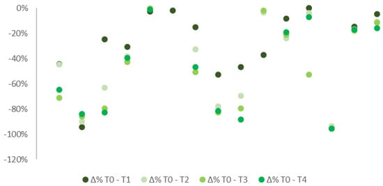 The analysis provided via the Wilcoxon signed-rank test with Bonferroni revealed that overall changes in VAS score over time were significant (p < 0.001). Moreover, VAS score assessed at each time point significantly differ from VAS score measured at baseline (p = 0.002, p = 0.004, p = 0.010, and p = 0.010 at T1, T2, T3, and T4, respectively) (Figure 2).