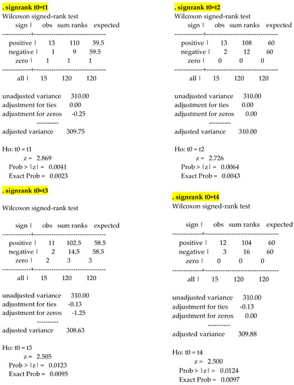 Data were entered into a spreadsheet (MS Excel Office 365 MSO), and Gretl (gretl.sourceforge.net/, accessed on 10 January 2022) was the software used to perform the statistical analysis. ∆% was calculated through the analysis of median VAS scale values at each time point. The choice to carry out this type of test was taken by virtue of the low sample numerosity. The test does not require making assumptions about the distribution of the population.