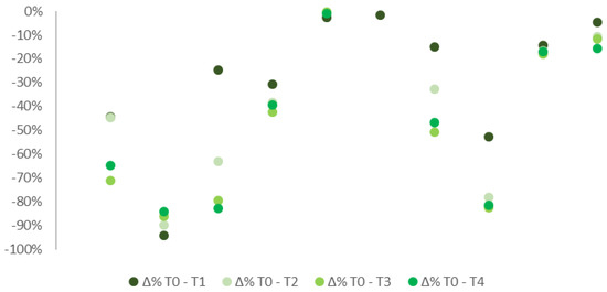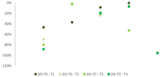 A decrease in pain levels in the overall sample was detected during the observational period between the initial stage and the following checks (Figure 1). Median VAS scale values, after the treatment was delivered, emerged notably lower than T0 (6.55), respectively 4.40 (T1), 4.03 (T2), 2.95 (T3), and 4.00 (T4).