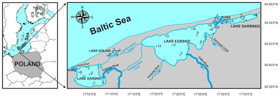 Locations of the studied coastal lakes of the southern Baltic Sea and sampling sites (numbers).