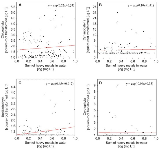 Generalized linear model for phytoplankton group metrics as response variables, and the sum of heavy metals as an explanatory variable, with the link function (log) based on chlorophyll-a concentration, as a measure of the biomass of the Chlorophyta (A), Cyanobacteria (B), Bacillariophyta (C), and Cryptophyta (D).