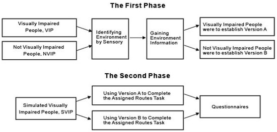 There were two phases in the experiment. The aim of the first phase was to establish two voice navigation versions (VIP established version A; NVIP established version B). The purpose of version A is to explore the route according to the situation of VIP itself (VIP is blind, vision = 0). The purpose of version B is to explore the route according to the situation of NVIP itself (NVIP is normal-sighted people, vision ≥ 1). Both groups were allowed to freely explore the environment in their familiar ways, without a time limit, before they recorded voice directions for the navigation. The second phase was the SVIP’s execution of missions designed for voice navigation version A and version B. Firstly, SVIP listened to version A and version B randomly, and executed designated missions. SVIP then answered a subjective questionnaire for the researcher to analyze and find out which version satisfied SVIP more, version A or version B? Procedures of the experiment are shown in Figure 1.