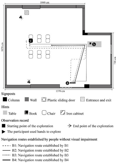 Allen explained that landmarks can help people orient and keep themselves on the right path in a certain direction. Some researchers have discovered that VIP’s way of memorizing landmarks is different from NVIP [18]. VIP tend to choose landmarks that have more sensory cues as rememberable points. For example, when VIP enter an indoor environment from outdoors, the change in temperature or in sunlight can provide VIP with useful cues to determine directions. However, when VIP stay indoors, there are fewer cues that can help determine directions (temperature and light in a room are usually steady), landmarks that VIP can use become not clear, and changes in each landmark are hard to perceive.