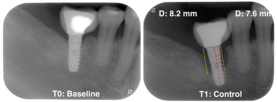 Standardized radiographs should be taken and compared with baseline radiographs when implants were placed in function [8]. The peri-implant radiographic bone loss (MBL) was determined by a calibrated examiner (VA) who calculated the possible bone loss by taking linear measurements from the most mesial and distal part of the implant platform to the crest bone in each implant. (Figure 1).
