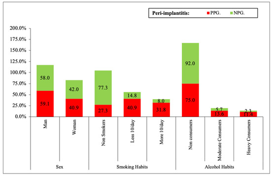 Statistical significance of general variables in peri-implantitis taking the patients as unit. Different variables: PPG—Non-smokers (27.3% * 5), NPG—Non-smokers (77.3% * 5). PPG—less than 10/day (40.9% * 3), NPG—less than 10/day (14.8% * 3). PPG—More 10/day (31.8% * 4), NPG—More 10/day (8% * 4). PPG—Non-Consumers (75% * 2), PPG—Non-Consumers (92% * 2). PPG—Heavy consumers (11.4% * 1), NPG (2.3% * 1). * 1: p < 0.05; * 2: p < 0.01; * 3: p < 0.001, * 4: p < 0.0001; * 5: p < 0.00001.