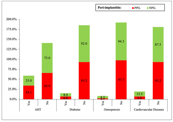For arterial hypertension (AHT), no statistically significant results were found in the present investigation in patients with arterial hypertension and peri-implantitis. There is a scarcity of bibliographic reports referring to hypertension and peri-implantitis, one of them is the one published by Wu et al. in 2016 [21]; they studied 325 implants and only obtained 0.6% of the complications. The difference in the results obtained in the present study from those published in the literature may be due to systemic control of patients in private medical centers; many of the patients selected in the study knew that they suffered from arterial hypertension but were not under medical treatment. It is known that antihypertensive drugs in general are beneficial for bone formation and bone remodeling and are associated with a lower risk of bone fractures; therefore, the use of antihypertensive drugs may be associated with a higher survival rate of osseointegrated implants. Most studies generalize about systemic conditions (other than diabetes) and conclude that it is a limited risk factor for developing peri-implantitis. Finally, the prevalence of hypertension is increasing in patients older than 60 years in developed countries. Patients with hypertension also require dental implant therapy, which is the reason that patients with AHT have an increase in peri-implant diseases. However, the impact of hypertension on the longevity of implant-prosthetic restorations is a topic for future research.