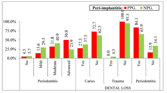 Variables related to periodontal disease and tooth loss according to peri-implantitis taking the patients as the unit. Different variables: PPG—Non-Periodontal (4.5% * 1), NPG—Non-Periodontal (5.7% * 1). PPG—Mild Periodontitis (13.6% * 1), NPG—Mild Periodontitis (29.5% * 1), PPG—Periodontitis (84.1% * 1), NPG—Periodontitis (65.9% * 1). PPG—no periodontitis (15.9% * 1), NPG—no periodontitis (34.1% * 1). 1: p < 0.05.