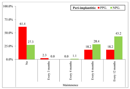 Patients who did not attend the periodontal maintenance show more peri-implantitis (61.4% PPG versus 27.3% NPG) than those that attend every 6 months (18.2% PPG versus 28.4% NPG) and those that attend every 12 months (18.2% PPG versus 43.2% NPG). Therefore, the frequency of periodontal maintenance has an influence on the peri-implantitis (Figure 5).