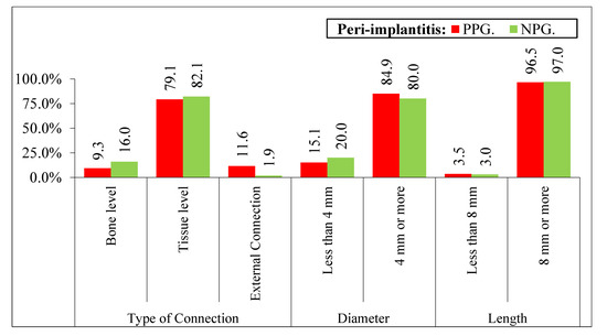 The parameters evaluated for the type of implant, diameter, and length do not show statistical differences with respect to diameter and length, and for the type of connection they were statistically significant (p < 0.0001). According to our results, the external connection is more likely to develop peri-implantitis compared to the internal connections at bone and tissue level implants. (Figure 6).