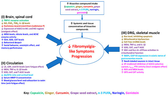 Diagram illustrates the potential actions of the bioactive compounds capsaicin, ginger, curcumin, grape seed extract, n-3 PUFA, naringin, and genistein on fibromyalgia-like symptoms. These compounds not only result in the production of pro-inflammatory cytokines, lipid peroxidation, and oxidative stress, but also result in upregulating antioxidant enzymes capacities in the nervous system, skeletal muscles, and circulatory system. The consequence is mitigation of the progression of fibromyalgia-like symptoms. Abbreviations: AA/EPA, arachidonic acid/eicosapentaenoic acid; CAT, catalase; CK, creatine kinase; CNS, central nervous system; DRG, dorsal root ganglion; GSH, glutathione; IL-1β, interleukin-1β; LA, lactic acid; LDH, lactate dehydrogenase; MAPs, muscle action potentials; MDA, malondialdehyde; MMP-9, matrix metalloproteinase-9; NO, nitric oxide; n-3 PUFA, n-3 polyunsaturated fatty acids; PGE2, prostaglandin E2; PNS, peripheral nervous system; ROS, reactive oxygen species; SDH, succinate dehydrogenase; SOD, superoxide dismutase; T-AOC, total antioxidant capacity; TNF-α, tumor necrosis factor-α; TXB2, thromboxane B2.