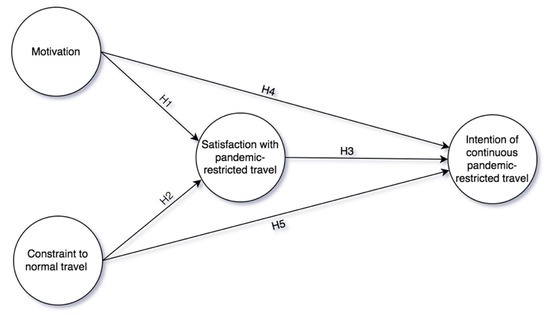 Satisfaction is defined as “the interaction between a tourism experience and expectation about the destination” [29] (p. 315). A close relationship between motivation and satisfaction has been empirically investigated in previous studies. For instance, Agyeiwaah et al. [30] showed that culinary tourists’ motivation positively influence satisfaction based on an analysis of 300 international tourists at cooking schools in Thailand. In the era of COVID-19, satisfaction is highly important to reflect tourism experience and it is a key strategy to recover tourism successfully [31]. Previous studies revealed that motivation can generate tourists’ expectations, which, in turn, satisfy people’s tourism experience. In addition, constraint to normal travel, as what has been defined in this study, refers to the way of passive motivation that stimulates people with physiological feelings and positive attitudes towards pandemic-restricted travel. Therefore, the constraint to normal travel as passive motivation may produce a positive outcome of pandemic-restricted travel. Therefore, this study presents the following hypotheses: