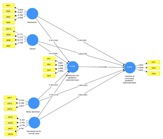 To deeply understand the indirect and total effects of motivations to travel and constraints to normal travel on the intention of continuous pandemic-restricted travel, this study examined specific indirect effects analysis with 5000 subsamples and a 95% confidence interval. The results as shown in Table 6 indicated that satisfaction mediates the relationship between two factors of motivation (exploration and leisure) and the intention of continuous pandemic-restricted travel (Exploration: indirect effect = 0.052, p = 0.017 < 0.05, 2.5% interval = 0.016 > 0; Leisure: indirect effect = 0.127, p = 0.000 < 0.001, 2.5% interval = 0.073 > 0). The total effects of leisure and exploration on the intention of continuous pandemic-restricted travel are with a p-value of 0.000 (p < 0.001) and 0.002 (p < 0.01). The variance accounted for (VAF) values of leisure and exploration are 0.381 and 0.323, respectively. It is regarded as partial mediation, since VAF values are between 20% and 80% [48]. In addition, satisfaction mediates the relationship between two factors of constraint (policy restriction and perceived risk) and the intention of continuous pandemic-restricted travel (Policy restriction: indirect effect = 0.045, p = 0.015 < 0.05, 2.5% interval = 0.013 > 0; Perceived risk: indirect effect = 0.043, p = 0.029 <0.05, 2.5% interval = 0.008 > 0). However, the direct effects of policy restriction and perceived risk on the intention of continuous pandemic-restricted travel are not significant (p > 0.05). Therefore, satisfaction fully mediates the effects of two constraint factors (policy restriction and perceived risk) and partially mediates the effects of two motivation factors (leisure and exploration) on the intention of continuous pandemic-restricted travel.