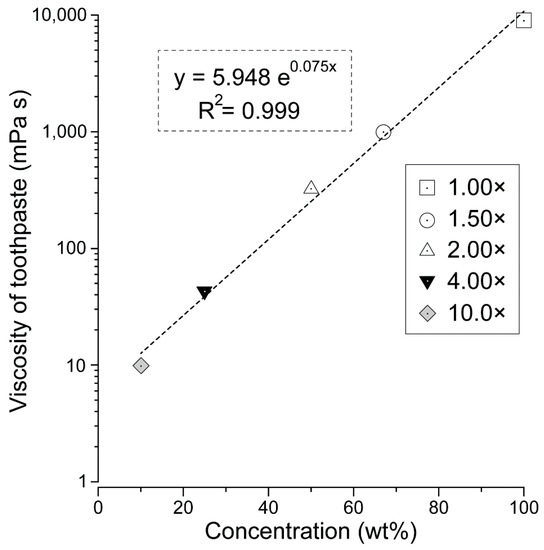 Relationship between toothpaste concentration and viscosity. The viscosity and correlation of each toothpaste concentration (1.00×, 1.50×, 2.00×, 4.00×, and 10.0×) are shown. The white square indicated dentifrice with a concentration of 100% (1.00×). White circles: 67% (1.50×); white triangles: 50% (2.00×); black inverted triangles: 25% (4.00×); gray diamonds: 10% (10.0×). A scatter plot was created with the logarithmic value of viscosity on the vertical axis and the concentration (%) on the horizontal axis. It was found that there was a strong positive correlation between toothpaste concentration and viscosity (r = 0.999).