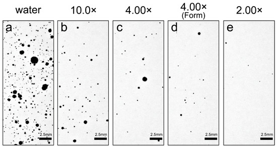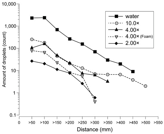 Only water and the 10.0× samples showed droplets beyond 400 mm (Figure 5). The number of droplets decreased sharply from 150 mm for all dilution ratios, and the number of droplets was fewer than 100 within a range of 150 mm or more, except for water. Comparing 4.00× with and without foaming, the number of droplets generated was reduced when foaming was present.