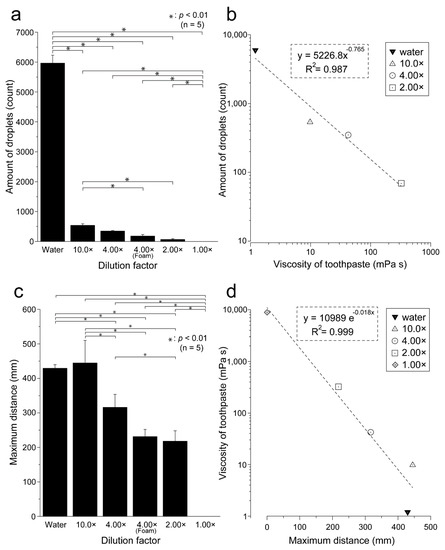 Comparison of the number of droplets generated and the maximum droplet distance by the toothpaste dilution ratio. (a) The relationship between the toothpaste dilution ratio and the number of droplets is shown. The number of droplets is presented as the mean ± standard deviation of five replicates per dilution ratio (n = 5); (b) the concentration of each toothpaste dilution (2.00×, 4.00×, 10.0×), the viscosity of water, and the number of droplets is shown. The black inverted triangles indicated dentifrice with water. White triangles: 10% (10.0×); white circles: 25% (4.00×); white square: 50% (2.00×); gray diamonds: 100% (1.00×). A scatter plot was created with the logarithmic value of the number of droplets generated on the vertical axis and the logarithmic value of the viscosity on the horizontal axis. There was a strong negative correlation between toothpaste viscosity and the number of droplets generated (r = −0.993); (c) the relationship between the toothpaste dilution ratio and the maximum flight distance is shown; (d) there was a strong negative correlation between toothpaste viscosity and the number of droplets generated (r = −0.999).