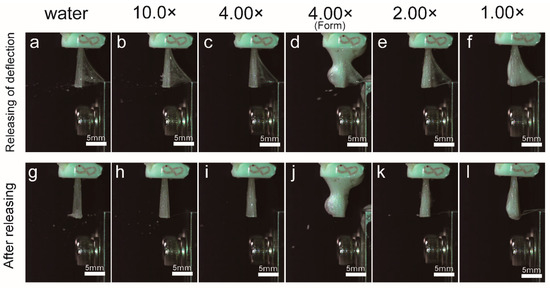 Figure 6 shows an image of the moment when droplets were generated as captured with a high-speed camera. In the case of water, a large number of water droplets were generated towards the front, lower region at the moment when the deflection of the hair bundle was released, and fine droplets were scattered (Figure 6). For 10.0× samples, the toothpaste adhered to the brush for a long time after the deflection had been released, and scattered forward and diagonally upward (Figure 6). For 4.00× samples, the number of water droplets generated was further reduced as compared to 10.0× samples (Figure 6). At 4.00×, the dynamics differed with and without foam. The number of droplets flying forward was suppressed in the case of foaming, as compared to the case of no foaming, and the entire foam vibrated, while no fine droplets were generated (Figure 6). Owing to the high viscosities of 2.00× and 1.00×, the toothpaste was seen to cling to the brush when the deflection was released, and almost no droplets were observed (Figure 6).