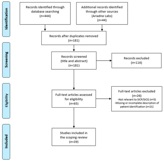 The initial database searches returned 444 results (CINAHL n = 105; MedLine n = 152; PsychInfo n = 29; PubMed n = 158). A list of 44 articles pertaining to the SICP published by Ariadne Labs was added to the raw list of articles from the initial database search as these articles were directly related to the SICP or SICG. Following the removal of duplicates, 181 articles progressed to title and abstract screening. Of these, 65 met the criteria for full-text review, and 39 met the inclusion criteria for the study. The reference lists of the articles marked for inclusion were examined, and an additional 16 articles were screened at title and abstract level. Of these, three underwent full-text review, but none met the inclusion criteria for the study. In total, 39 articles were eligible for inclusion in this scoping review (Figure 1).