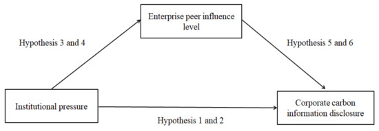 For the issue of carbon information disclosure, enterprises are the main body of the implementation of the action, which can play a huge subjective initiative in the specific process of carbon information disclosure [51]. At present, due to the role of a social contract, the relationship between enterprises and external stakeholders has become closer. Under the influence of external institutional pressure, explicit institutional pressure restricts the carbon emission behavior of enterprises in the form of mandatory provisions, while implicit institutional pressure such as Confucian culture also affects the behavior choice of enterprises in people’s hearts, forming a social atmosphere of energy conservation and emission reduction. In order to show the outstanding comparative advantages of enterprises in the same industry in the fierce social competition, enterprises will take the initiative to learn from enterprises with high-level carbon information disclosure after an in-depth analysis of the current industry reality, which gradually makes their carbon information disclosure level meet the internal requirements of the industry development at this stage [52]; therefore, in order to alleviate the adverse effects of the above-mentioned pressure as soon as possible, enterprises will cater to the needs of stakeholders for information and respond to the call of the national low carbon environmental protection concept. Then, they expand the disclosure of carbon information content of enterprises and make a timely cognitive response to the institutional pressure. At the same time, enterprises will maintain the relationship between themselves and the external subjects, put an end to the phenomenon of strong exclusion of the public or fall into the disadvantaged position of severe punishment by the environmental protection department, and finally achieve the purpose of establishing a good social image for the enterprise [53,54]. In conclusion, when enterprises are faced with different institutional pressures, they will adjust and regulate their carbon information disclosure behavior clearly by learning and imitating the carbon information disclosure behavior of peer enterprises; that is, the enterprise peer influence can play a mediating role in the relationship among explicit institutional pressure, implicit institutional pressure, and corporate carbon information disclosure.