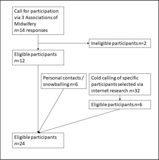 To recruit suitable interviewees, contact was established with the Associations of Midwifery in Bavaria, Lower Saxony, and North Rhine-Westphalia. With the support of the associations, a call for participation was sent to the midwives who belonged to these associations and put on the websites. Midwives who contacted us were asked about their education and professional experience, as well as the catchment area of their professional activities and were then, if their answers were appropriate, included in our study. Thus, we had an initial sample of midwives, which was completed by subsequent snowballing and personal contacts. Further cold calling was performed in order to recruit midwives working in rural areas as these were underrepresented in the sample (for further details cf. Figure 1)