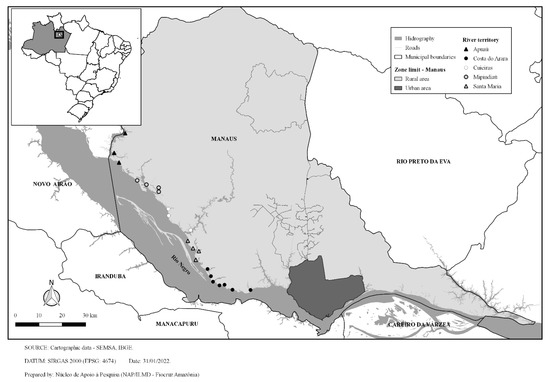 The study is a cross-sectional household-based survey carried out in 38 rural riverside locations along the Rio Negro River from the rural area of Manaus to the municipality of Novo Airão, Amazonas, Brazil (Figure 1). The administrative records of Pap smears performed in the territory from January 2016 to May 2019 were also analyzed in the study. The study population was distributed in five micro-areas covered by an FHT, whose activities have been described elsewhere [10].