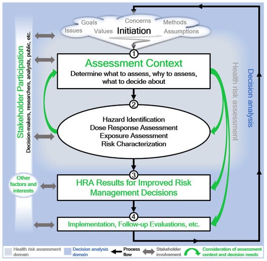 Apart from a few open-ended i.e., “other” responses to several questions (e.g., that the selection of the assessment endpoints or the importance of other important information depends on the assessment or decision context), most of the survey responses indicated a lack of understanding of the fit-for-purpose concept of HRA []. It is not reasonable, or even wrong, to assume the credibility or relevance of the specific findings of an HRA without assuring that the assessment is fit for its intended purpose. Fitness for purpose is crucial for improving the utility and effectiveness of HRA in informing decisions and should be ensured from the earliest stages of the assessment process. The origins of every HRA are in the initiation phase, which should gain full attention from risk analysts and assessors. It should be recognized, however, that the initiation phase requires a lot of consultations, tolerability, respect, and patience among the stakeholders involved, since there are often unclear and vague or unspecific expressions and issues that need to be clarified, consolidated, and eventually approved (blurred cloud in Figure 2). Such issues include perceived health concerns in different population groups. Therefore, the initiation phase must support the active participation of stakeholders. This can be facilitated by decision analysis tools and methods [,] that improve the understanding of stakeholders’ concerns and values, help identify and clarify the actual decision problem and its most important components, and determine whether and how detailed assessments of health risks are actually needed and how they should be performed [,,,].
