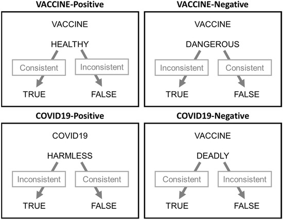 In each IRAP trial (Figure 1), four stimuli were presented simultaneously: one of the labels was presented at the top of the screen, one of the targets in the center, and the two response options (‘true’ and ‘false’) were presented at the bottom of the screen, one on the left and one on the right. The left response option was associated with the key ‘D’, while the right response option was associated with the key ‘K’. The left–right positions of the response options changed randomly on a trial-by-trial basis. A correct response, i.e., a response in accordance with the association rule given at the beginning of the block, cleared the screen for 400 ms and then another trial was presented. In the case of a wrong response, i.e., a response not in accordance with the association rule given at the beginning of the block, a red X was presented between the two response options until the participant gave the correct response. Following the label–target association given, IRAP included four trial types (see Figure 1): COVID-negative, COVID-positive, VACCINE-negative, and VACCINE-positive.