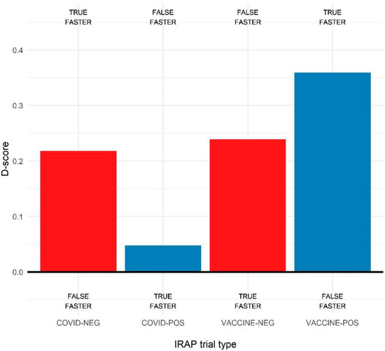 The D-scores for the four trial types were calculated, that is, COVID-19-positive, COVID-19-negative, VACCINE-positive, and VACCINE-negative. As shown in Figure 2, the average D-scores were positive, indicating a bias toward the consistent rule, that is, COVID-19 was negative and VACCINE was positive. Then, a series of one-sample t-tests on the four IRAP D-scores separately was conducted to assess the significance and the strength of each bias. For each analysis, we report the average score, 95% confidence intervals, t-test statistics, and Cohen’s effect size as d. The analysis revealed a significant positive bias for the COVID-19-negative trial type D-score, M = 0.22 [0.15, 0.29], t(143) = 6.02, p < 0.01, d = 0.50. It also revealed significant positive biases for both VACCINE-negative, M = 0.24 [0.17, 0.31], t(143) = 6.48, p < 0.01, d = 0.54, and VACCINE-positive D-score, M = 0.36 [0.39, 0.42], t(143) = 11.18, p < 0.01, d = 0.93. The D-score relative to the COVID-19-positive trial type was not significantly biased, M = 0.05 [−0.02, 0.11], t(143) = 1.48, p = 0.14, d = 0.12. Thus, all significant biases were in the expected direction and with a moderate to large effect size.