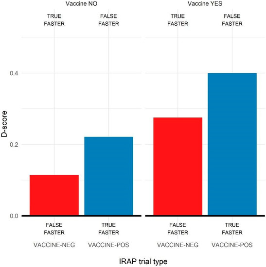 Overall, participants reported a bias toward considering the vaccination as positive in V-IRAP. This result was in line with the recent literature on the acceptance rate of the COVID-19 vaccine, which is very high in Italy. Furthermore, this result supports the view that people mainly accept the vaccine because they feel it is safe and useful in fighting the spread of the disease [44]. Another possible explanation was that people actually fear the infection and thus act to reduce the risk of being infected or contracting the disease [26]. This alternative or concurrent explanation appeared to be supported by the positive bias shown for the relational COVID-negative, indicating that people tended to associate the disease with negative targets more easily than with positive ones. In light of this result, the study supports previous results obtained with self-report measures in which individuals showed higher compliance to vaccination as their risk perception towards the disease increased [23,45], or if they felt the vaccine was safe or not harmful [27]. Thus, our study showed that the population tends to get vaccinated because they trust the vaccination and fear the disease or the infection [2].