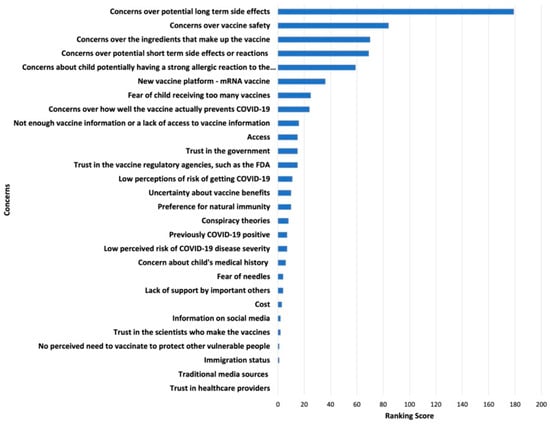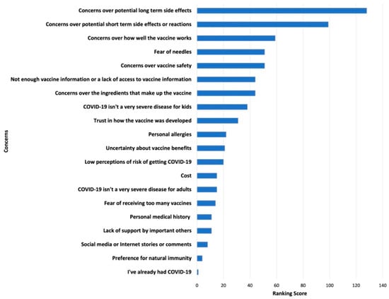 Survey results of parents’ and adolescents’ ranking of COVID-19 vaccination concerns and motivators are shown in Figure 1, Figure 2, Figure 3 and Figure 4. Their concerns centered on vaccine confidence, with top concerns for parents focusing on long-term vaccine side effects. One of the adolescents’ top concerns in addition to confidence was fear of needles. Parents’ and adolescents’ motivators to vaccinate showed that confidence in the vaccine ranked at the top. Additionally, unique pandemic-related factors that motivated willingness to vaccinate included vaccinating for social benefit and collective responsibility.