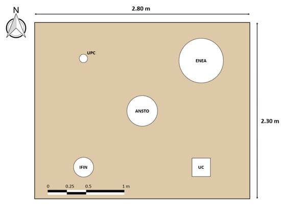 The intercomparison campaigns were performed in two different fields: a low and a high radium activity area. Sites were selected on the basin of their radium content in soil with the purpose of studying the response and behavior of the systems both in areas where low and high radon exhalation rates were expected. The procedure followed to place the devices in the soil surface was the same for both experiments. First, the grass layer was removed in an area of dimensions 2.80 m × 2.30 m to simplify the installation of the accumulation chambers in the ground. The relative position of every device was the same in both campaigns, as shown in Figure 1. For each campaign, five soil samples were collected (at 4 corners and in the center of the area) in order to determine the average radium activity concentration (Bq/kg) of the field and the homogeneity. The samples were measured by the Laboratory of Environmental Radioactivity, University of Cantabria (LaRUC), accredited according to UNE-EN ISO/IEC 17025:2017 for activity concentration measurements of soil by gamma spectrometry using a high-purity germanium detector.
