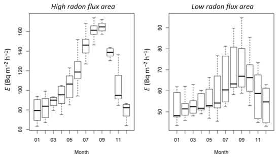 Additionally, Figure 4 shows a boxplot of the monthly average of the radon flux predicted for these sites by the radon flux model presented in Karstens et al. 2015 using data for the period 2006–2010 based on soil moisture data from the Noah Land Surface Model in the Global Land Data Assimilation System (GLDAS Noah) []. The average monthly values of this model output for October climatology was about 138 Bq m−2 h−1 and 66 Bq m−2 h−1 at the high and at the low radium content areas, respectively.