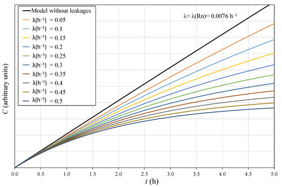 Theoretical approach of radon concentration over time for the first 5 h depending on λ (h−1) for the same radon flux value. Curves obtained from Equation (2) with a time interval of 10 min.