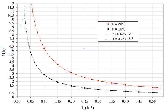 The radon exhalation value used for the theoretical approach in Figure 5 is the same for all the curves; the only difference between them is the effective decay constant. Considering different time periods, radon flux can be calculated from the curves using Equation (3). Then, the error due to the linear approximation can be obtained as the difference between the radon flux calculated assuming linearity and the real value. Maximum linearity time t can be estimated as a factor of λ for a fixed level of maximum deviation; 10% and 20% are considered here (see Figure 6). Given that, a relationship is obtained with = 0.287 for 10% and = 0.625 for 20% maximum deviation. A similar theoretical study was completed [,] considering two points for the linear fit, but in this approach, pairs of values every 10 min from Figure 5 were used.