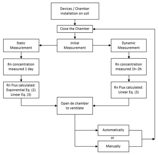 The static measurement experiment (24 h duration) intends to serve as reference to determine the leakage from the exponential adjustment, but before, it has to be considered that immediately after the installation of the chamber into the soil, some time should be allowed for the exhalation conditions to reach equilibrium. After the static measurement, the dynamic measurement commences; a flowchart explaining the measurement procedure followed for the campaigns is presented in Figure 7.