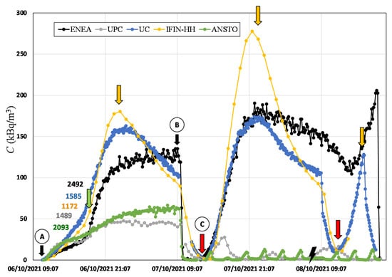 The radon concentration time series measured by each monitor within their respective accumulation chambers during the high radon flux area campaign, carried out between 6 and 8 October 2021, is shown in Figure 8. The first accumulation period (point A to B, Figure 8) started on 6 October at 10:30 a.m. and lasted for approximately one day. A change in the trend of the radon concentration accumulated inside the chambers was observed after 6 h from the beginning of the measurement (green arrow in Figure 8). ANSTO, UPC, and ENEA devices describe two exponential growths. However, UC and IFIN-HH devices follow a sigmoidal curve, which was not the expected exponential behavior according to Equation (2). Furthermore, they experienced a degassing event at midnight (orange arrow in Figure 8). This could be explained due to the variation of the radon flux over the night and/or of the leakages of the system during the measurement period forced by environmental conditions in the soil (i.e., soil water content) or in the atmospheric layer in contact with the soil (temperature, pressure, wind, etc.).