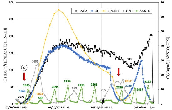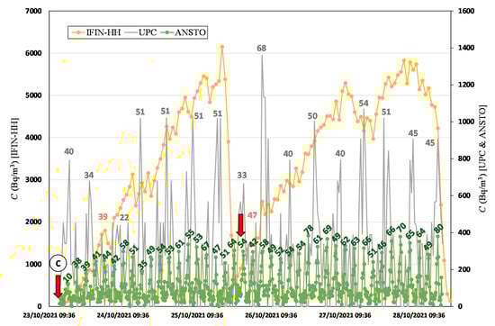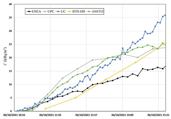 This section describes the experimental results of the intercomparison campaigns both at the high and at the low radium activity areas. The procedure followed was the same for the two campaigns, as explained in the previous section (see flow chart in Figure 7). During the first day, all the devices were set to accumulate radon in a static mode: for the ANSTO, the drum lid was closed permanently, for the UPC device, the air pump was switched off and the valves were closed, and in the ENEA device, the upper valve was closed. The UC and IFIN-HH devices measure in a static way by default.