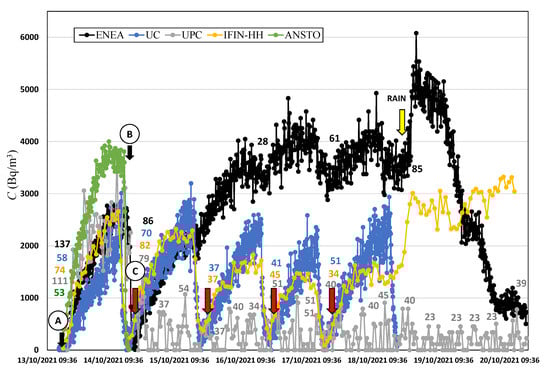 After the 24 h static accumulation experiment of the first day, all accumulation chambers were opened until the radon monitors showed background values. From this point, the accumulation chambers were opened and closed automatically (ANSTO and UPC), manually (UC and IFIN), and in the case of ENEA’s device, the upper valve was opened. The different phases of the measurement are shown in the following plots, which are indicated as follows: