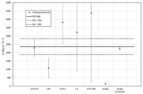 Figure 13 and Figure 14 present the participants’ radon exhalation results with its standard deviation, obtained from Table 5 and Table 8, for the high and low radon area campaigns together with the model results. Additionally, the consensus value and an interval of ±20% from Table 9 are included. From the previous data, the relative difference and the z′-score were calculated; see Table 10. It is observed again the spread of the results for the high radon area campaign with great differences with consensus value, but the results are coherent considering the standard deviation. In case of low radon flux area campaign, D (%) is reduced in most of the cases, and the z′-score provides the most acceptable values compared to those in the high radon area campaign. Once again, the main difficulty of analyzing the results in a rigorous manner is the low number of results. The parameters of Table 10 can be taken as information, but the main affecting factor is the number of measurements.