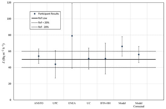Reference radon flux value Eref and standard deviation SDref obtained from participant results according to ISO 13528:2015, including the parameter σ = 0.2· Eref. “Model” indicates the prediction proposed by Kartsens et al. (2015) for the month of October and “Model Corrected” indicates the prediction adjusted considering the experimental values measured for radium in soil content. Values are expressed in Bq m−2 h−1.