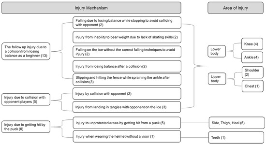 The response results from in-depth interview were coded according to question, and extracted topics were categorized and analyzed. Injury mechanism and the area of injury were represented with the diagram shown in Figure 2. Injury mechanism was analyzed with three categories, which were the follow up injury due to a collision with opponent players from a lack of skating skills by losing balance, direct collision with an opponent player, and being hit with the puck. All the interviewees have had experiences with wounds from pucks hitting areas without protection, such as the teeth, inner and outer thigh, feet, flank, etc., as well as knee, ankle, shoulder, and chest injuries after collision. Particularly, P1 and P2 also mentioned experiencing shoulder trauma. Such injuries were usually due to slipping and falling on the ice or crashing onto the fence after colliding with an opponent. Bumping with an opponent can also directly lead to ankle injury after entangling and falling onto each other.